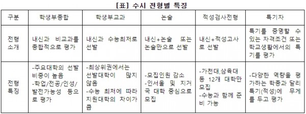 안녕하세요 에듀K 입니다. 예비고3 수험생들은 방학 잘 보내고 있나요? 이제 2020학년도 입시는 마무리되어가고 있고, 2021학년도 입시가 시작됩니다. 수시 원서접수는 9월부터 시작되고, 생기부 마무리는 8월30일 이므로, 2021학년도 입시는 이제 7개월 남짓 남았다고 말할 수도 있을것 같네요.. 수험생들 질문중 하나가, 수시로 지원할까요? 정시로 지원할까요? 답은 이미 정해져 있다. 75% 내외 수험생을 선발하고 있는 수시전형을 간과하고 정시 지원을 한다고 하는 것은 잘못된 선택일 수 있습니다. 아래 수시전형은 크게 5가지로 요약해서 정리해 놓은 표 입니다. 적성고사 전형은 올해가 마지막 해이므로, 그 어느해보다 치열할 수 있습니다.
