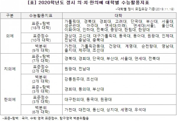 의·치·한의예과 모집 대학의 대부분은 수능 영역 중 수학, 과학탐구영역 반영비율이 매우 높다. 충남대가 수학 비율 45% 반영으로 가장 높고, △가톨릭대 △고신대 △단국대 △대구가톨릭대 △서울대 △성균관대 △아주대 △전북대 △중앙대 △한림대는 40%로 수학 영향력이 매우 크다.