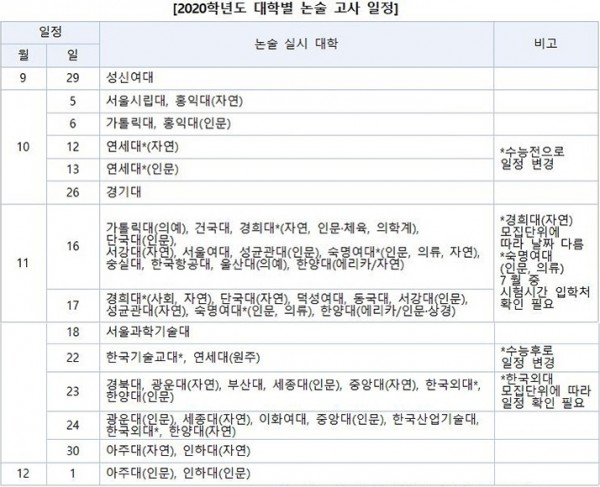 안녕하세요 에듀K 입니다. 오늘은 2020학년도 논술전형 일정에 대해 공유하고자 해요~^^ 보통 논술시험은 수능전 및 수능후 로 나뉘는데요.. 수능전 시험을 치르는 대학들이 수능후 보다는 다소 경쟁률이 낮게 형성됩니다. 이번 2020학년도 논술에서는 전년도에 비해 다소 입시 일정이 변경되어지는 학교들이 많은데요.. 이는 경쟁률의 변화도 진행 될 수 있을듯 합니다. 서울여대가 가장 논술일정이 빠른 시기에 시험을 치르게 되며, 전년도 3~4개 대학들과 날짜가 중복되었는데요.. 올해는 단독으로 시험을 치르게 되서 경쟁률이 다소 올라갈 것으로 생각됩니다. 연세대학교는 올해 수능최저학력기준을 페지하고, 또한 논술일정도 수능전으로 변경하여, 경쟁률이 전년도에 비해 많이 상승되어질 것이라 생각됩니다.